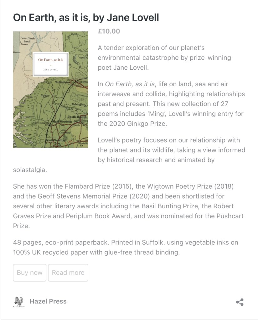 You can contact me directly if you would like to purchase a book. Please note that there are very few copies left of Forbidden, and One Tree is sold out. On Earth, as it is – is also sold out and now only available as a PDF from Hazel Press… but I have a few signed copies tucked away 😉 (£12.95 inc. P&P.)